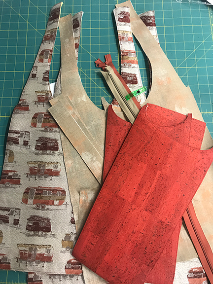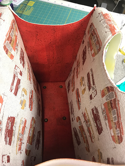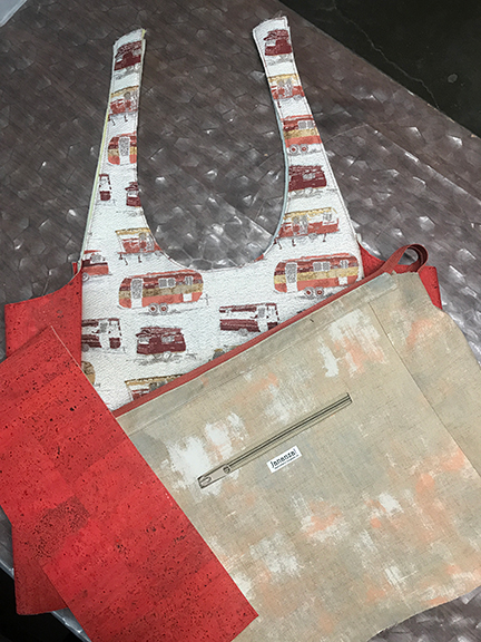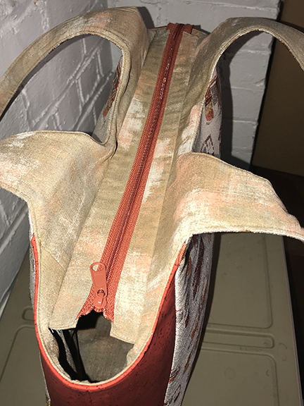 • Cork fabric for the exterior side panels, purchased from Sew Sweetness. I’ve purchased cork fabric from a number of different retailers, and the cork that Sara Lawson stocks on her Sew Sweetness site beats all the others, hands down. It’s like sewing butter, and does not crack (as many cork fabrics do). If you want cork, go to Sara’s site. (I believe this Coral is what I purchased, but it may have been the Candy Red or Brick. I just don’t remember.);