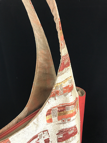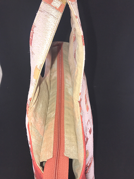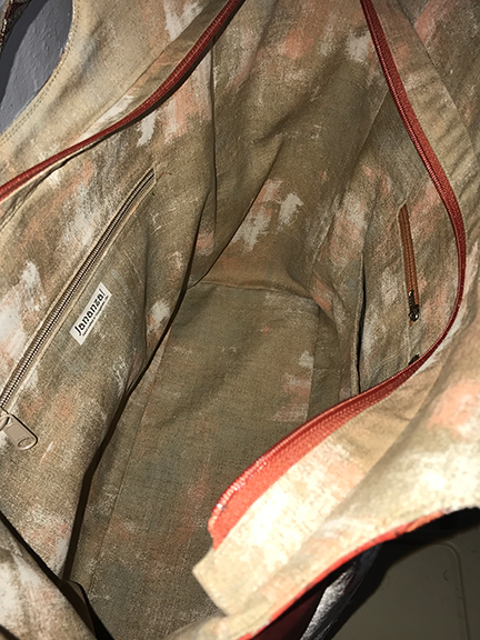 What do I wish I had done differently in the construction of this bag? Well, those little zippered pockets. Rather than order another 14″ zipper for two interior zippered pockets the pattern specifies, I decided to use two of the shorter zippers I had purchased in Bali two years ago. What I ended up with was downsized pockets that are hard to get your fingers into. What can they be used for? I think a lipstick and a lip balm; your change, to keep it from getting lost in your wallet; your driver’s license and other ID and a credit card, and a few bills, for when you don’t want to take your entire wallet along; and so on. Honestly, when I realized how small those pockets turned out, I should have stopped right there, ordered another zipper, and done the pockets as suggested. Live and learn!