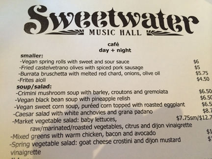 After driving down a scenic route through the Valley of the Moon, we found a parking place a few steps from “fig” and thought we’d walk in to see the chances of getting a table. Voila! Walk in. Sit down. Enjoy!