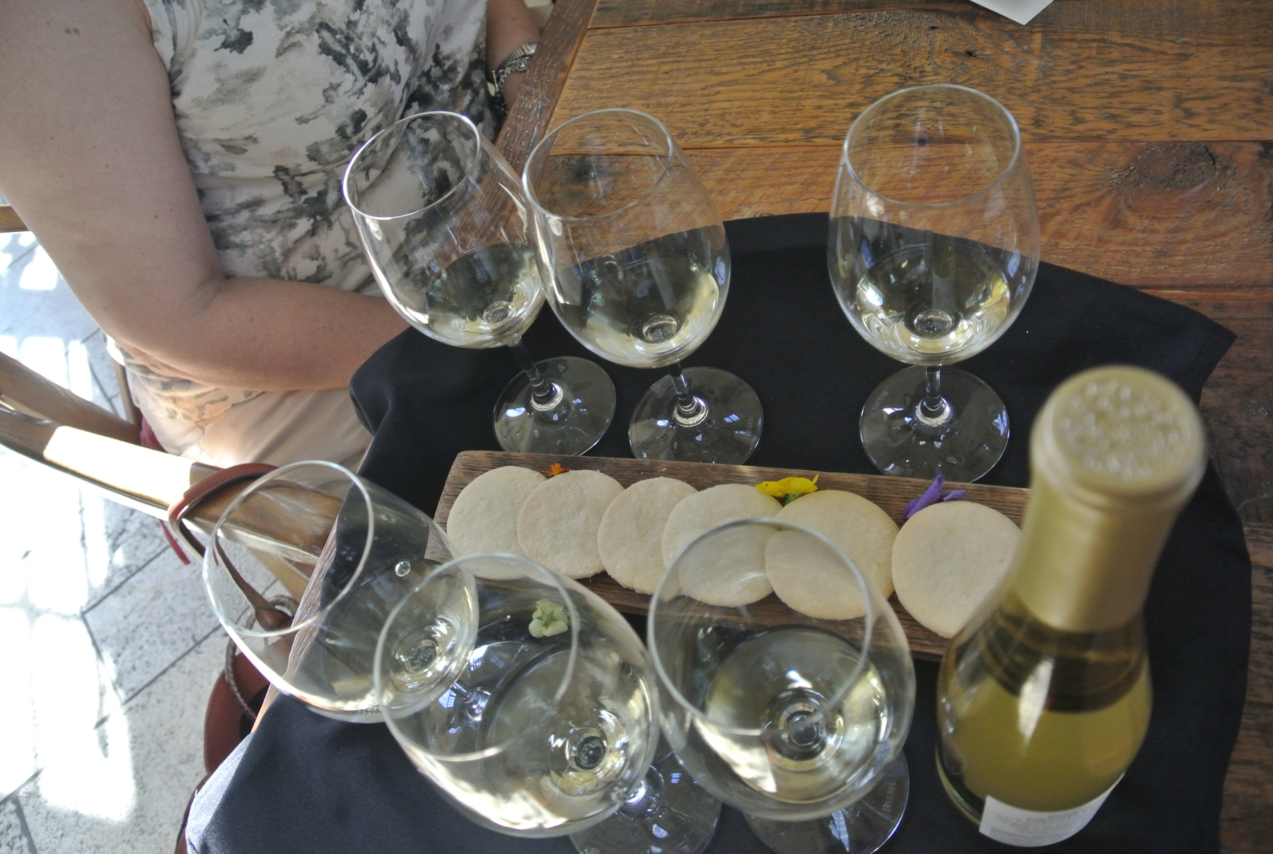 Next we visited Tudal Winery in St. Helena, with a cheese and cracker tray for us to enjoy along the drive. The environment and ambience of Tudal couldn’t be more different from Rutherford Hill. The adjectives that come to mind are natural, down-home, and personable. Where Rutherford Hill was a monogrammed polo shirt kinda place, Tudal was jeans and Tom’s tennies or Birkenstocks. Sadie, the standard poodle, greeted everyone with understated joy, and accepted all head pats graciously. We picked grapes off the vine and relished the intense flavor. We sat in a room decorated with a sense of humor and learned about Tractor Shed Red, the Wednesday pizza wine that’s available at Costco. Luis laid our lunch out on a picnic table and we sat in the shade with a gentle breeze blowing while we ate sandwiches and an incredible quinoa salad, finishing with “Aussie bites” cookies. And of course there was wine.