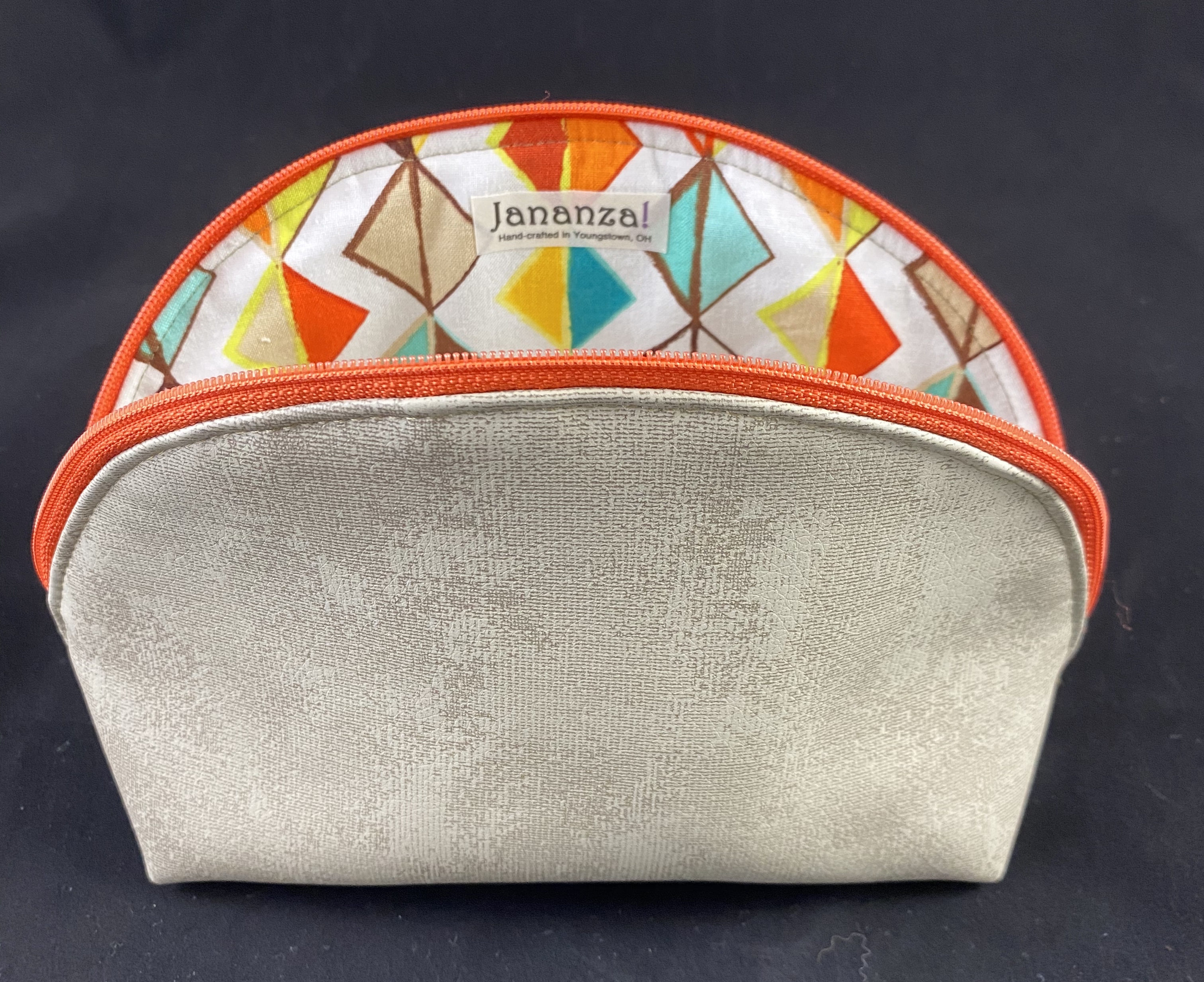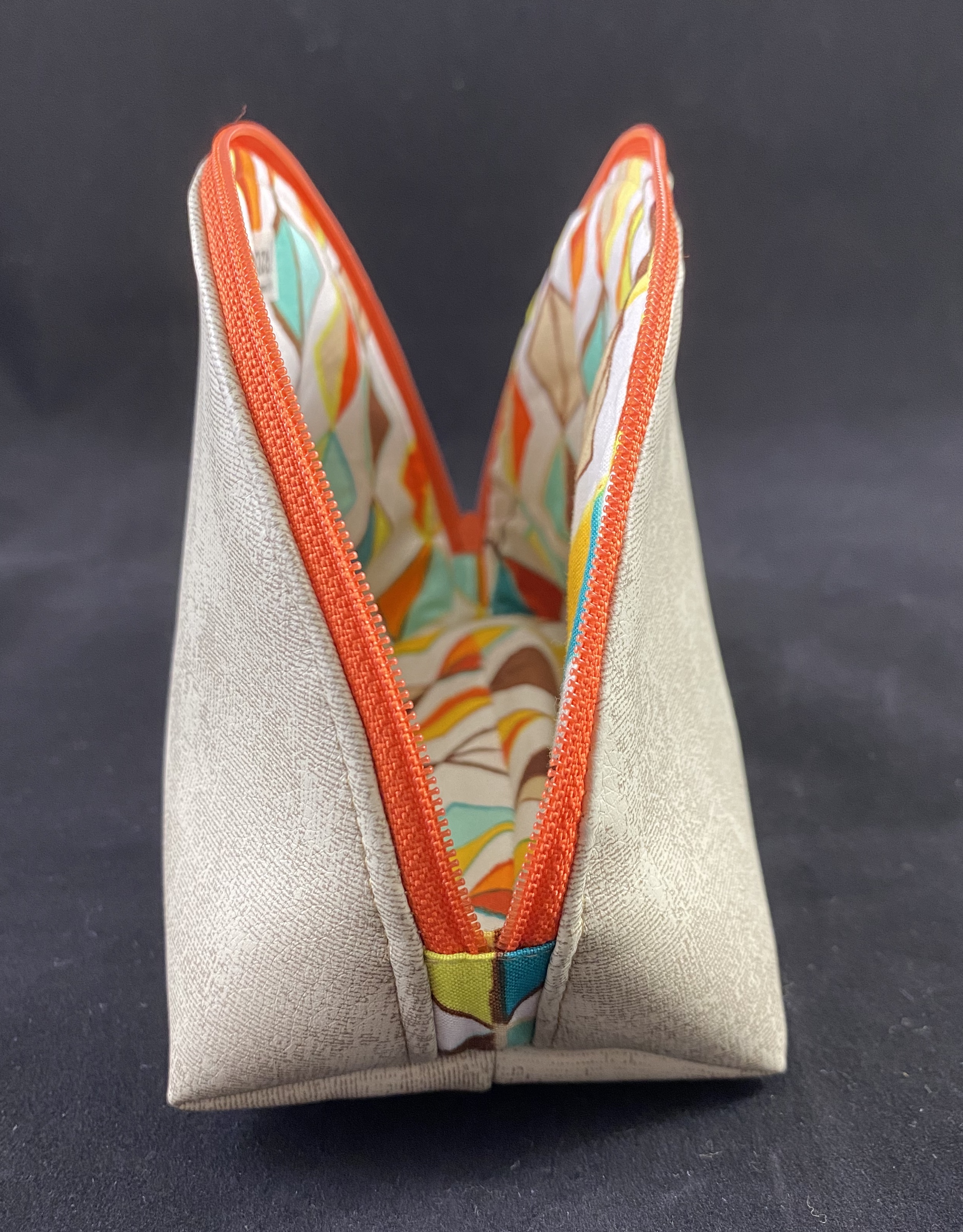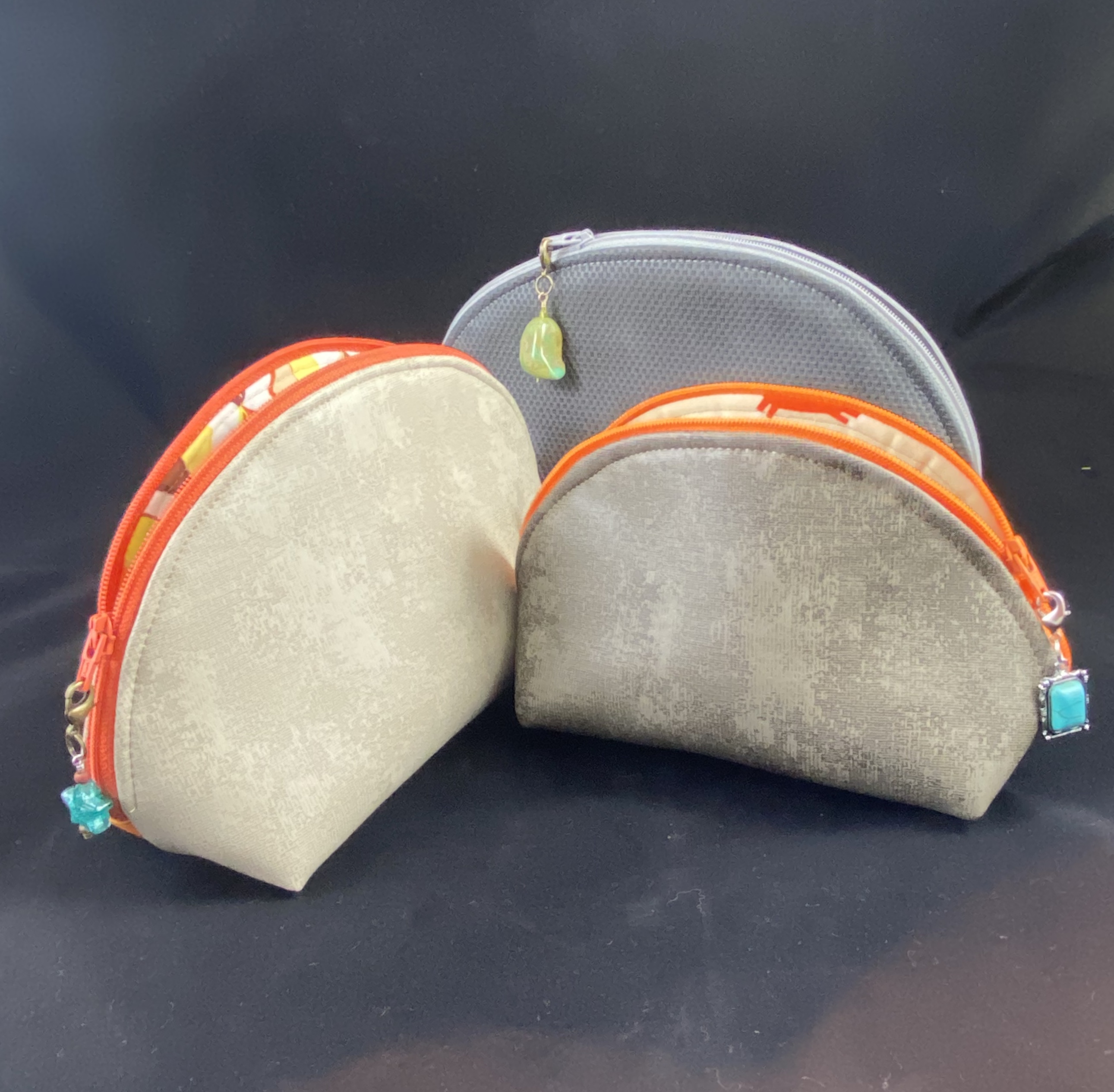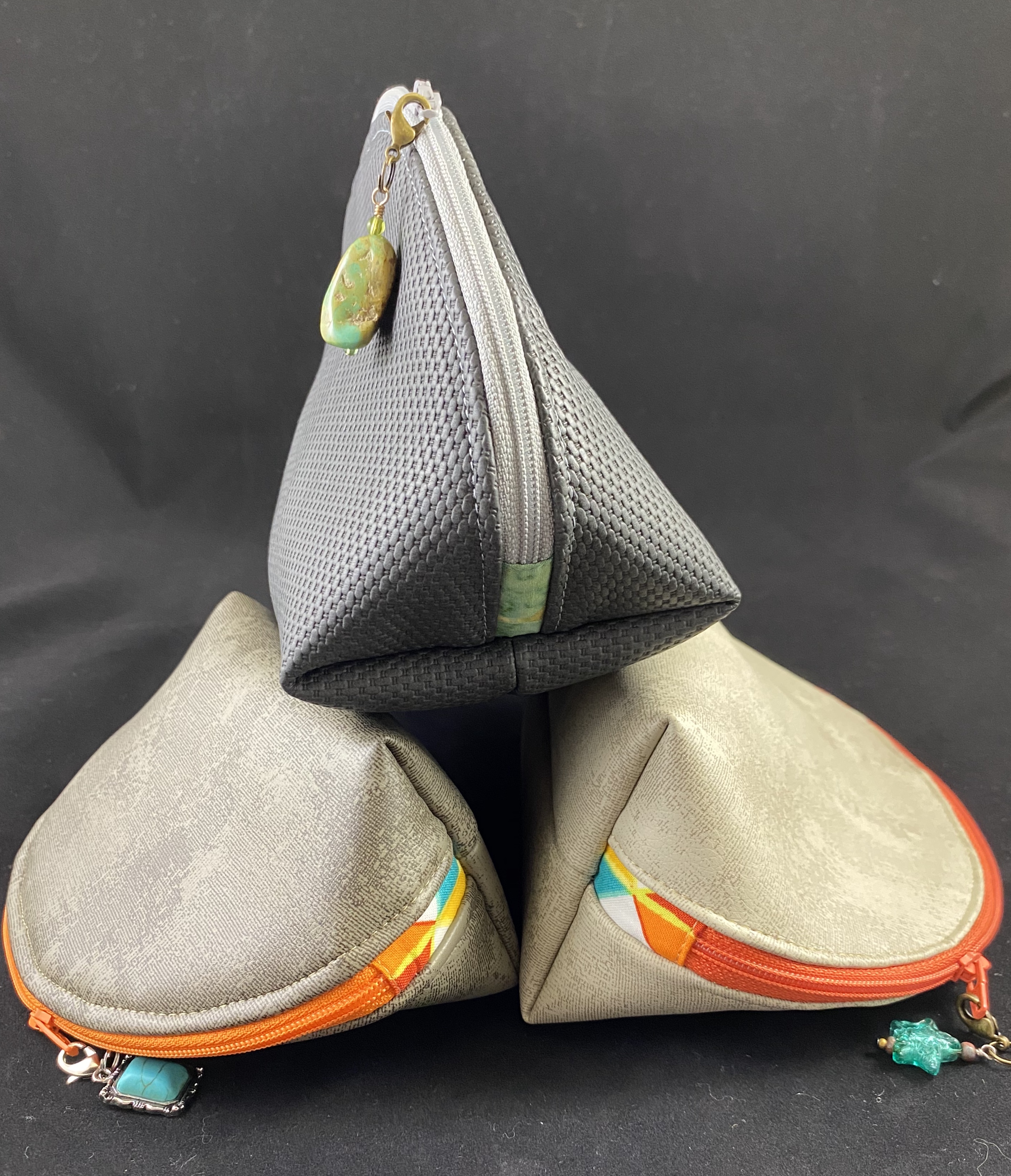 These are the small, medium, and large versions of the Persimmon Dumpling Pouch. The exterior fabric on all three is from Richloom Fabrics’ RV line of fabrics, designed by my nextdoor neighbor for use in upholstery in RVs. Number 1 was made 9/3; Number 2 on 9/4; Number 3 on 9/4.