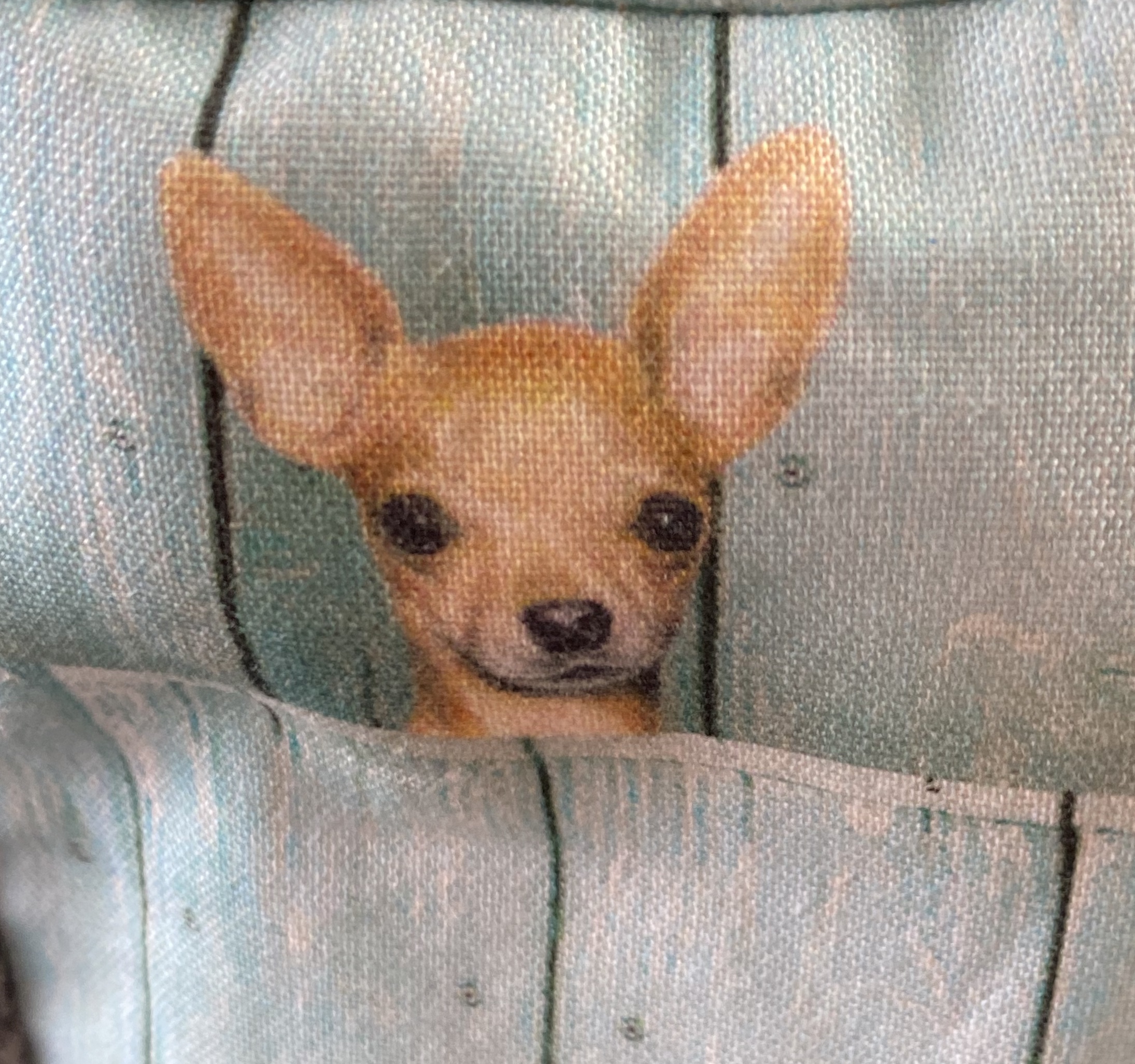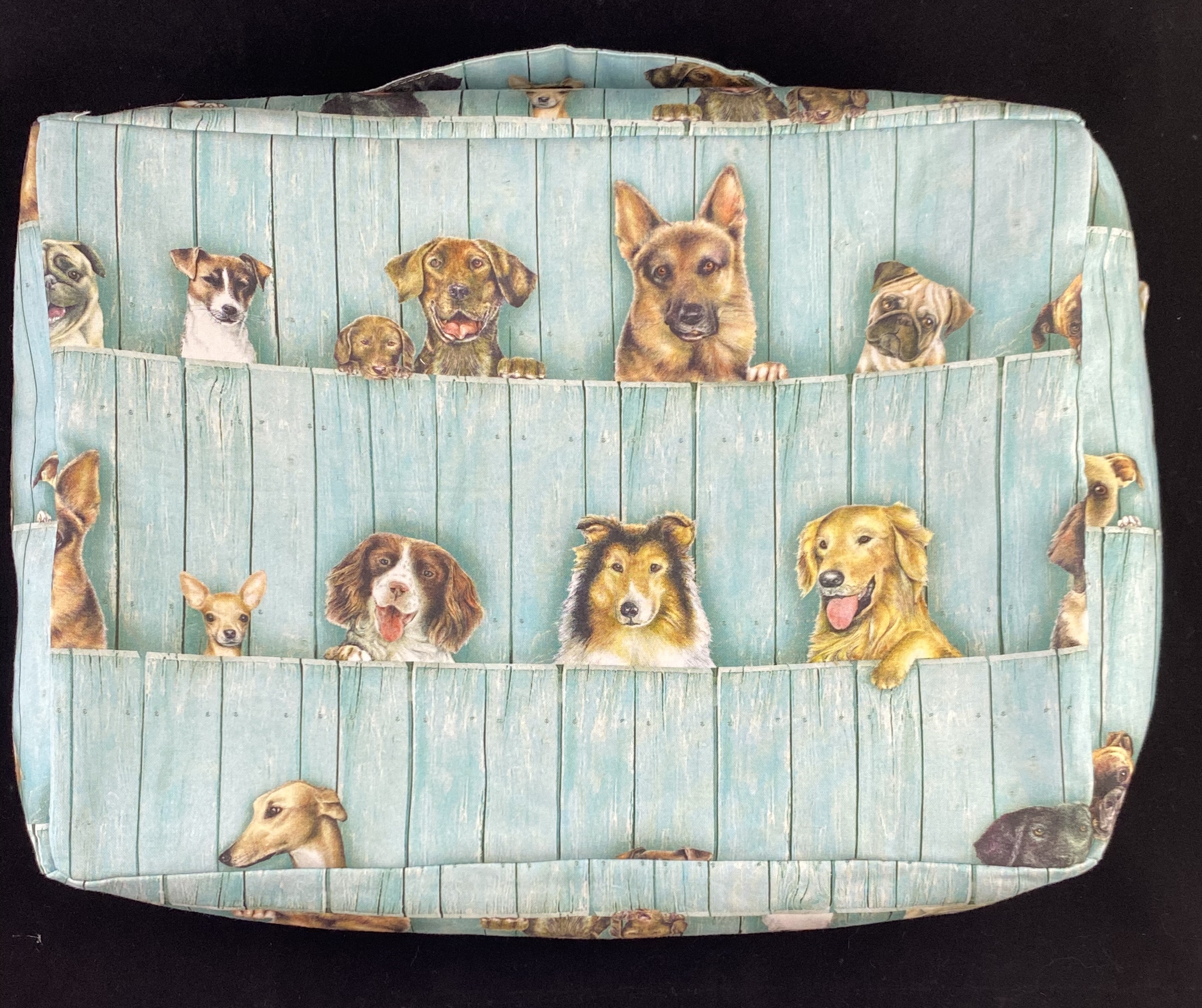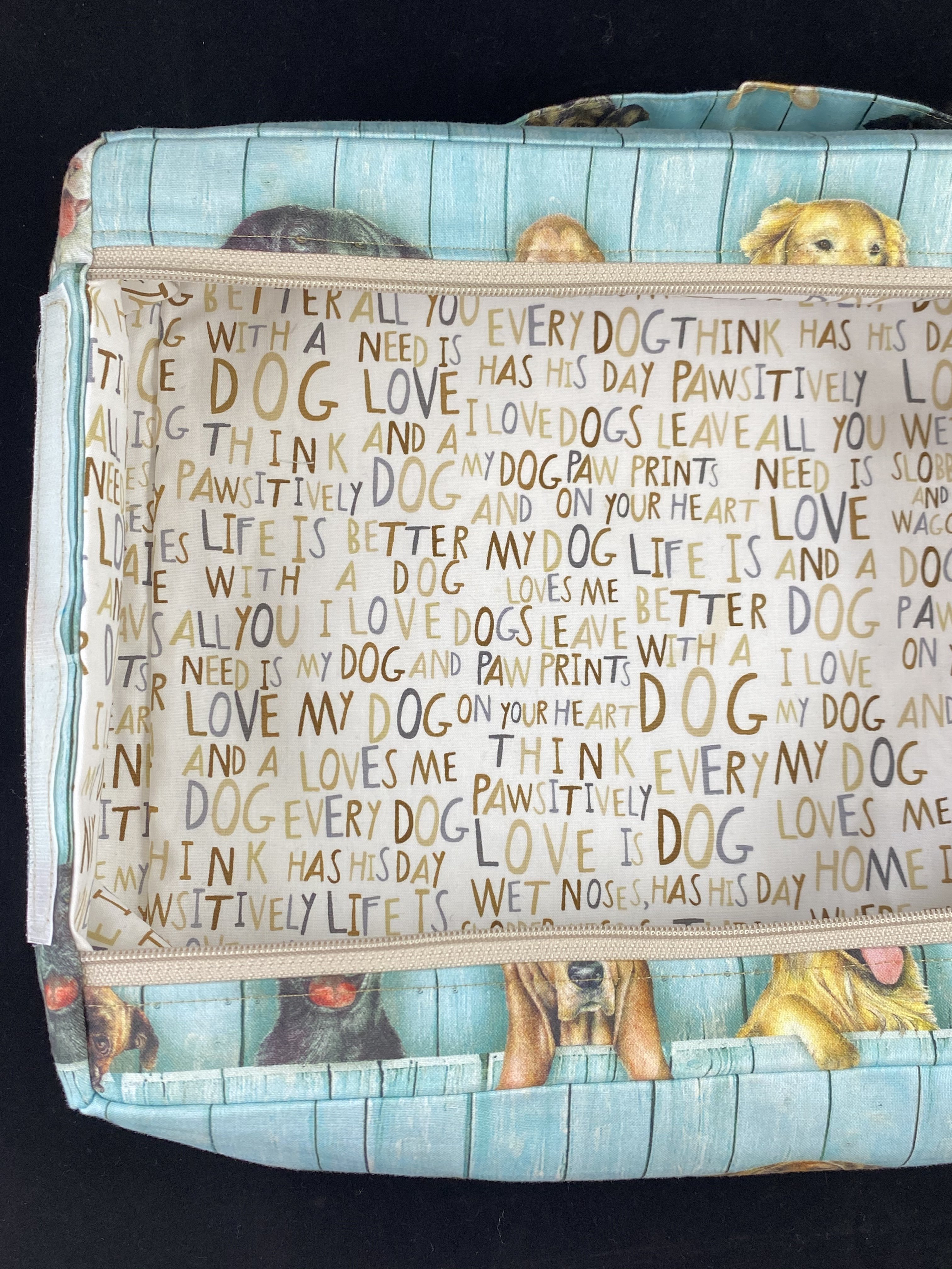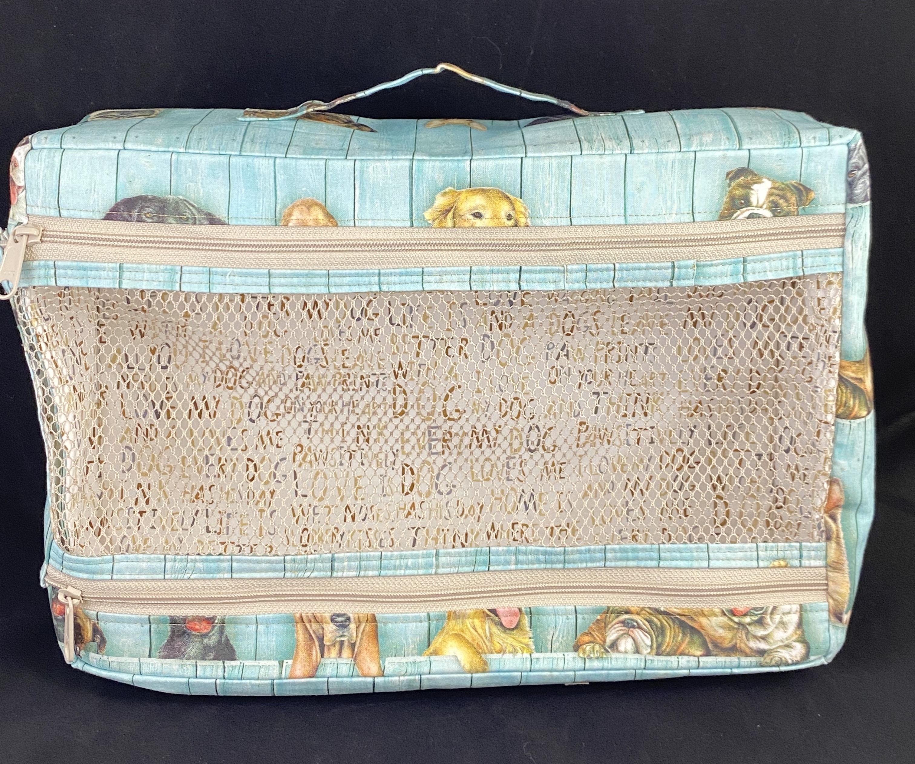 A Vacation Packing Cube made for my youngest grandchild, who lives in Amarillo with her mom and—very soon—her stepdad (my son), and two Chihuahuas. The fabric is “Picket Fence Pups” from the Whiskers & Tails collection by Bob Bowdige for Robert Kaufman Fabrics. The lining is also from Robert Kaufman’s Whiskers & Tails, “Dog Words” in Natural. Pouch finished on 9/5.