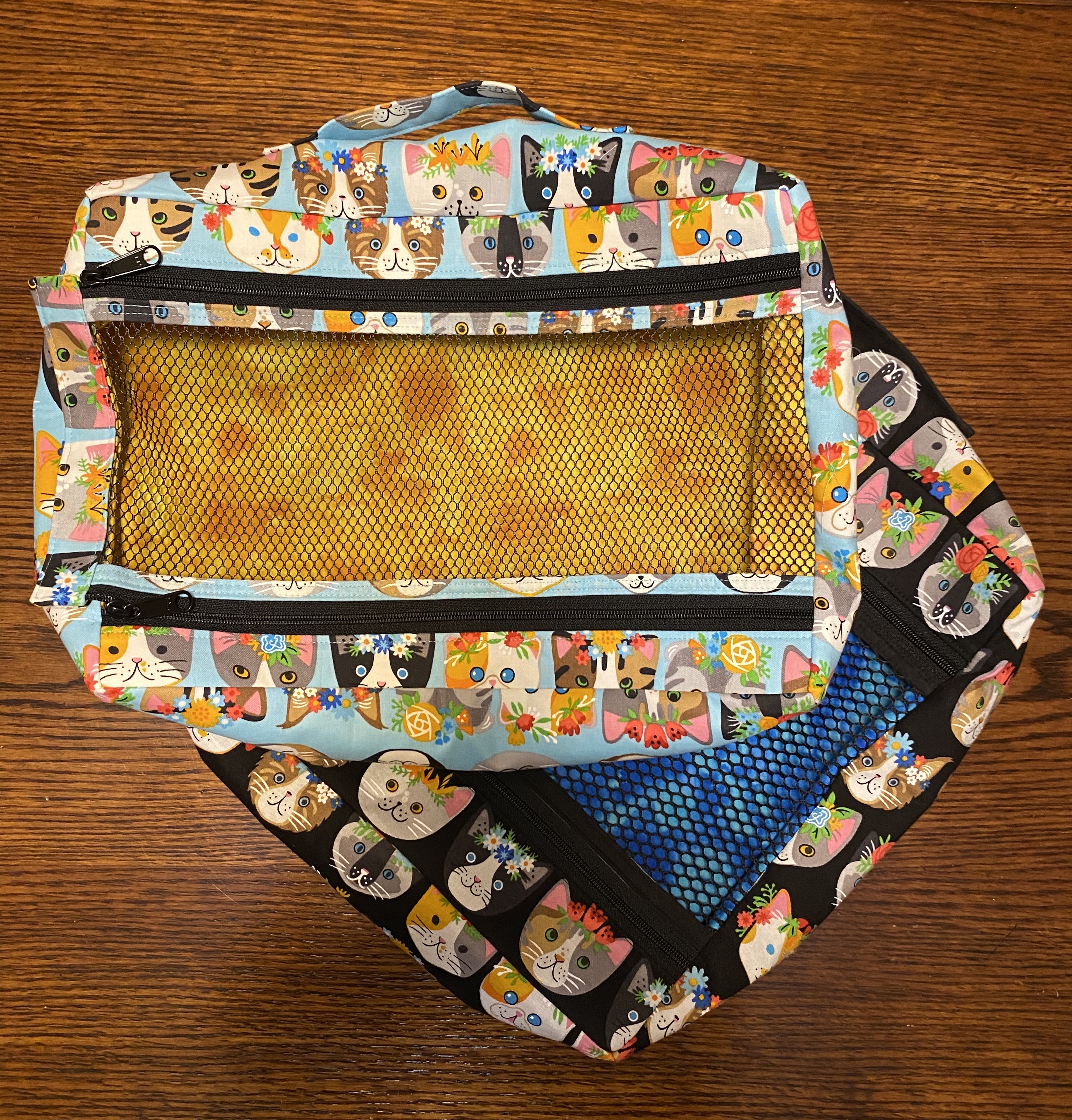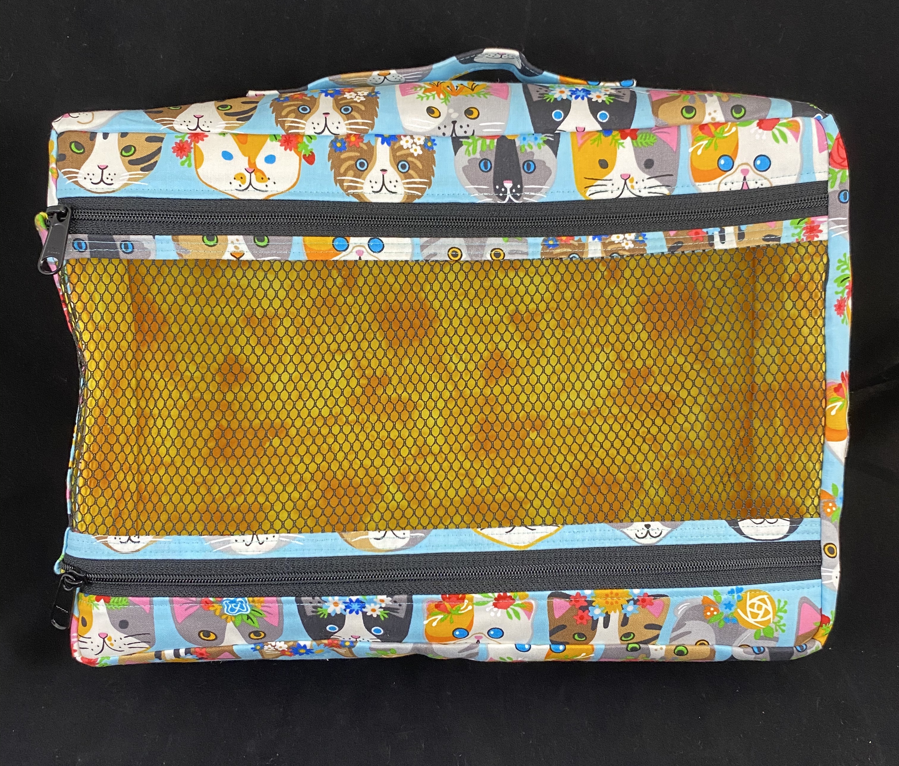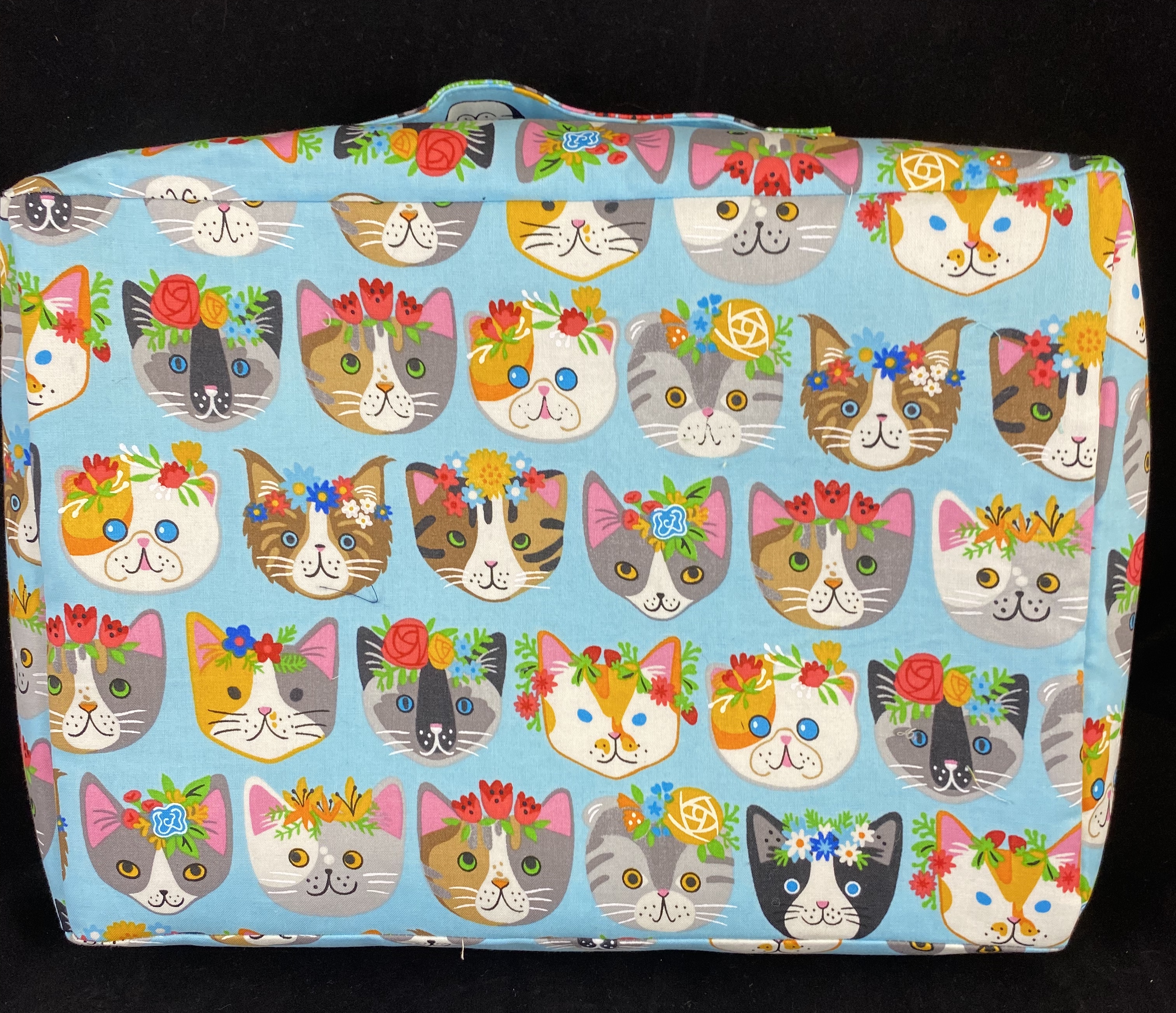 Before I started the 100 Pouches challenge, I had made a Vacation Packing Cube for myself, in hopes that someday we’ll be able to travel again, sans Covid-19. I love these cat fabrics that are part of the Whiskers & Tails collection for Robert Kaufman Fabrics. The first one I made was size Large. This is size Medium, and in a different colorway. There is also a version with a pink background. It appears to be sold out everywhere that stocked it. If I can find a half yard of it, I will make a third pouch to complete the set.The designer of these darling adorned cats is the brilliant artist Neiko Ng. Pouch finished on 9/27.