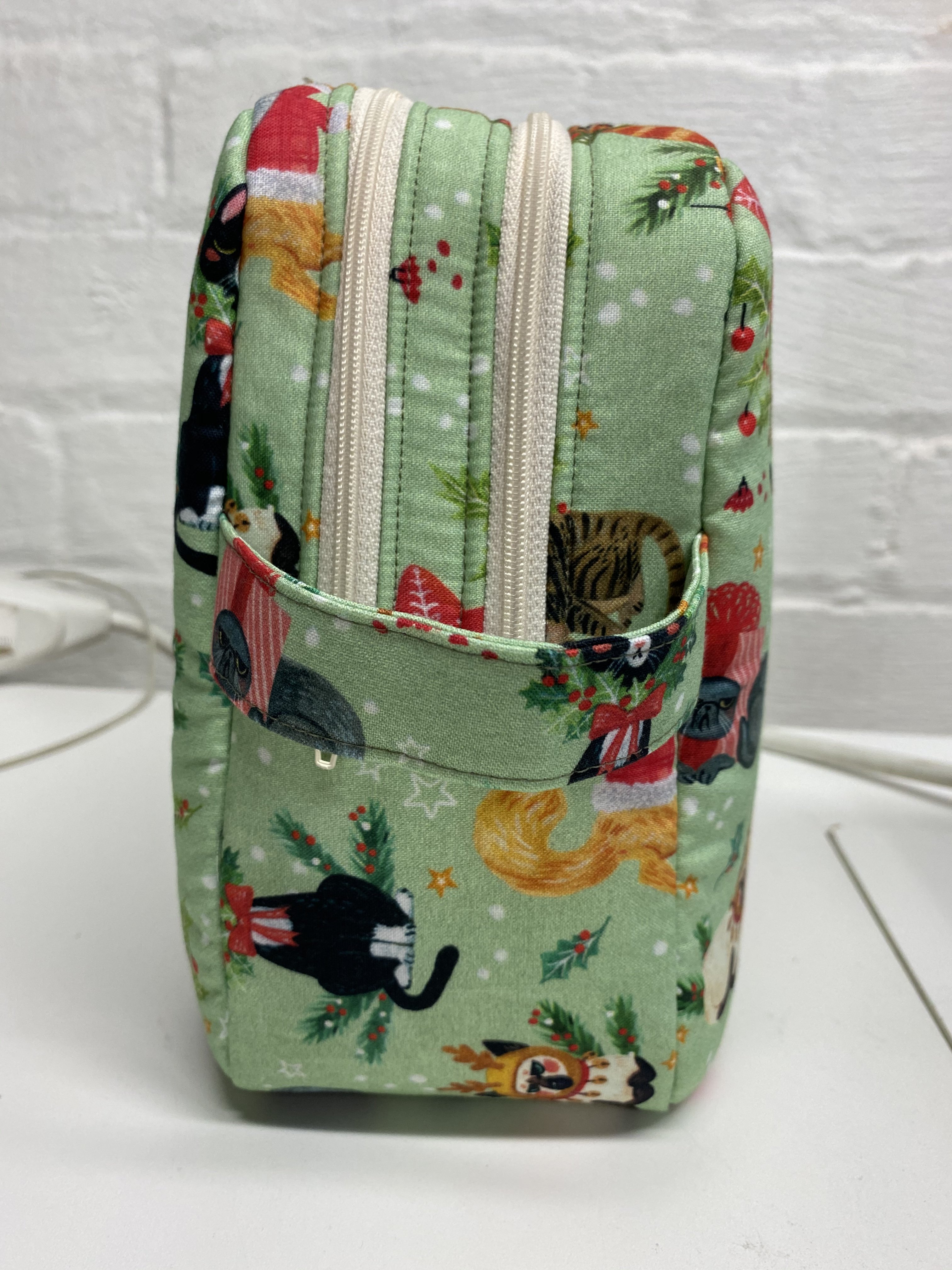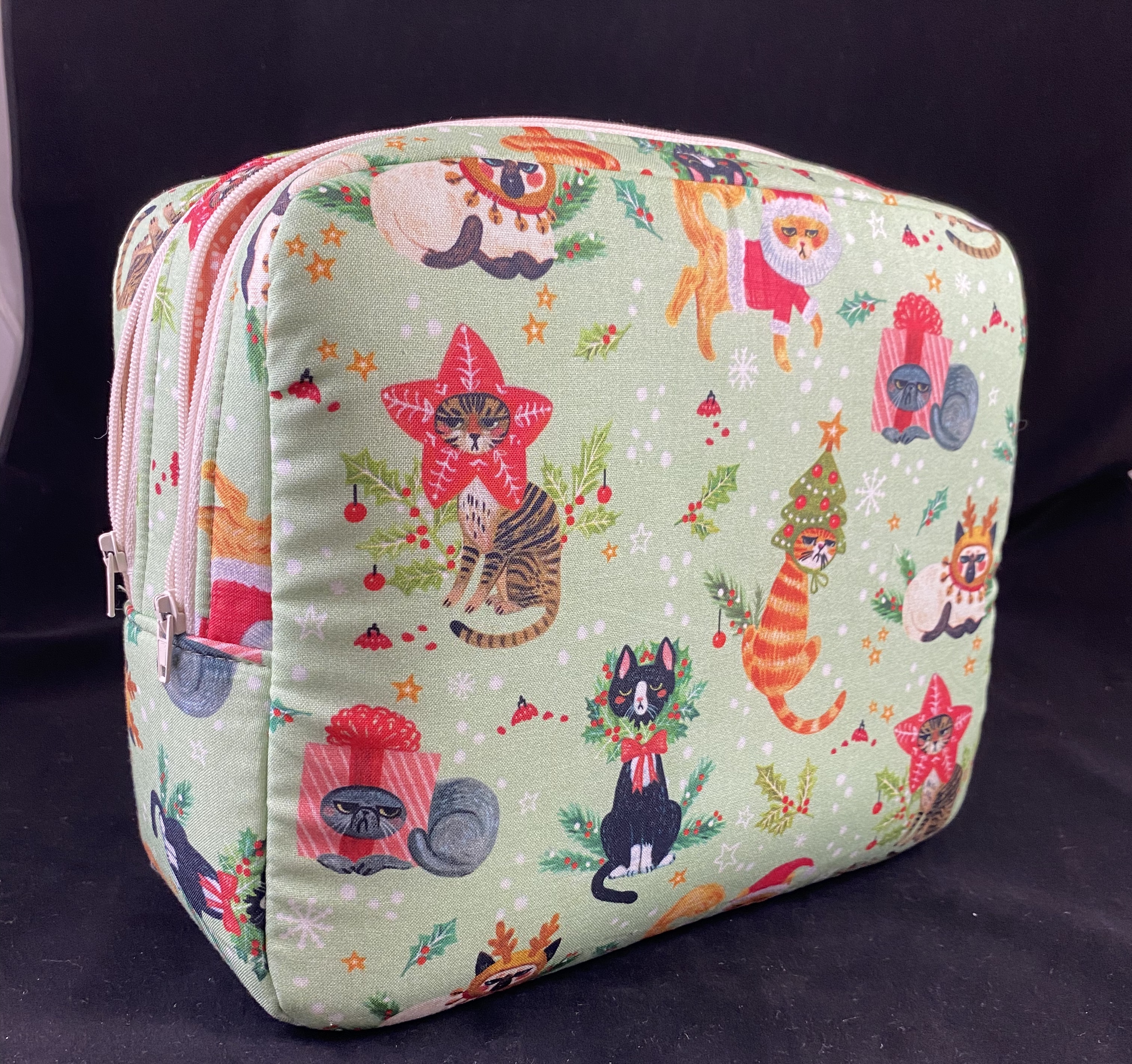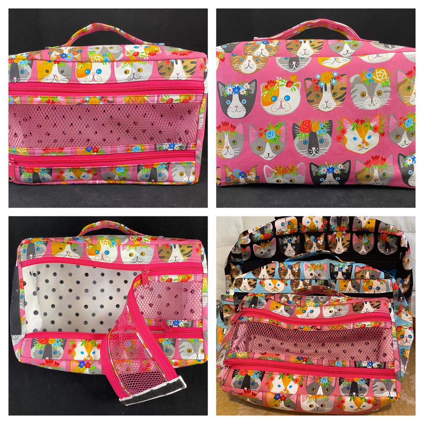 Before I started the 100 Pouches challenge, I had made a Vacation Packing Cube for myself, in hopes that someday we’ll be able to travel again, sans Covid-19. I love these cat fabrics that are part of the Whiskers & Tails collection for Robert Kaufman Fabrics. The first one I made was size Large. This is size Medium, and in a different colorway. There is also a version with a pink background. It appears to be sold out everywhere that stocked it. If I can find a half yard of it, I will make a third pouch to complete the set.The designer of these darling adorned cats is the brilliant artist Neiko Ng. Pouch finished on 9/27.
