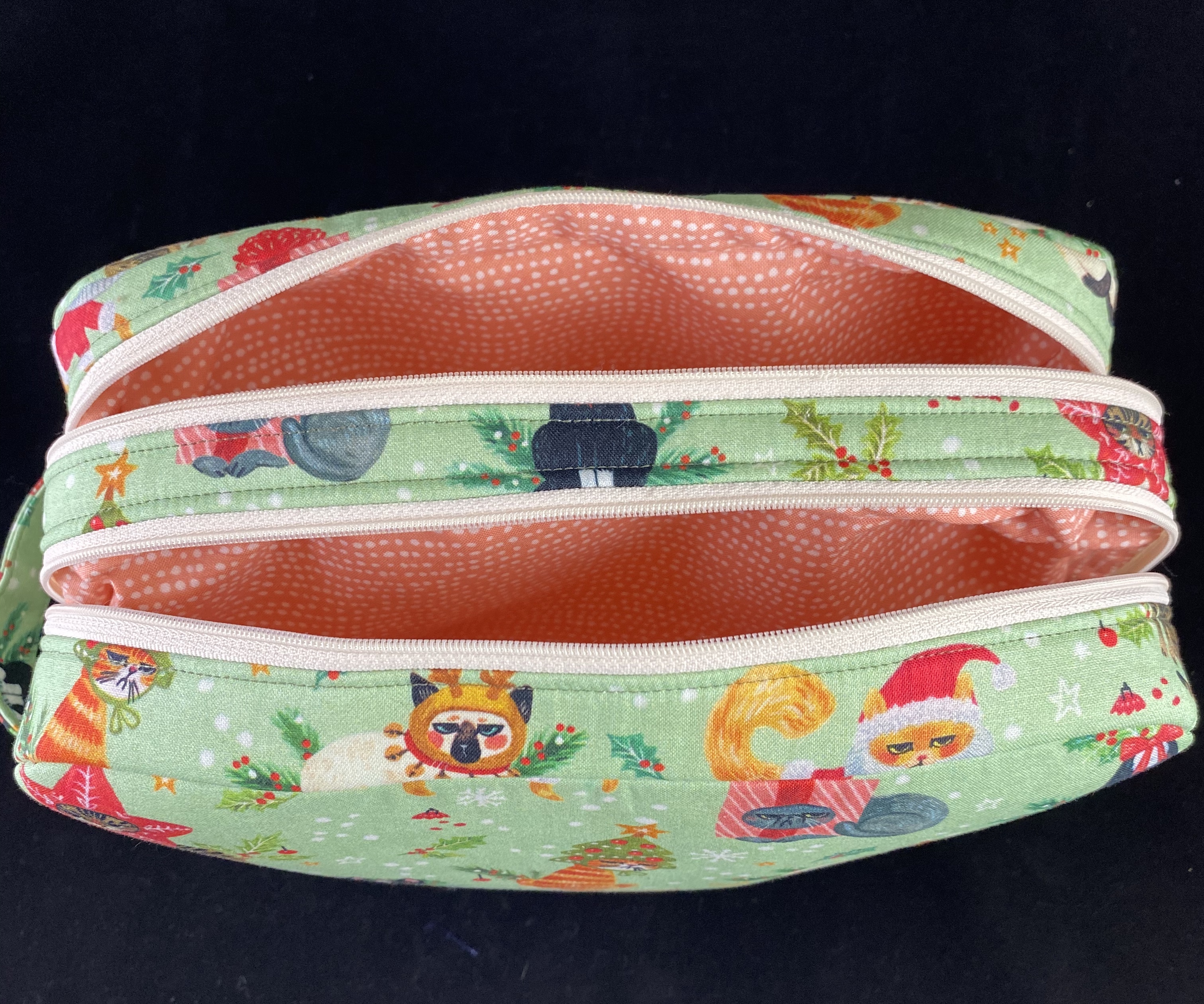 A pattern I had not made before is the Disco Double-Zip Pouch. Two things about this make: 1) I didn’t realize the fabric was a Christmas Cat print. I thought it was only a Cat print. So I thought no one would buy a Christmas fabric to use year around and it was therefore not suitable to put in my Etsy shop. I have since changed my mind on that issue. 2) The way the zippers are put in the top is narrow strips on the outsides and a wider strip in the center. Oops. I put the wider strip on one of the outsides and a narrow strip in the middle. Again, I thought everyone would see that error and the bag wasn’t good enough to sell. When I posted the photo on the Sew Sweetness Fans Facebook page, several people said they couldn’t see the narrow vs. wide error, so—again—I’m changing my mind and posting it on Etsy. Pouch finished on 10/2. P.S. Many thanks to the mother of my grandchildren for raising her hand when I asked if anybody wanted this bag. She loves dogs and cats and all animals, and was raised by parents who loved Christmas. Win:win.