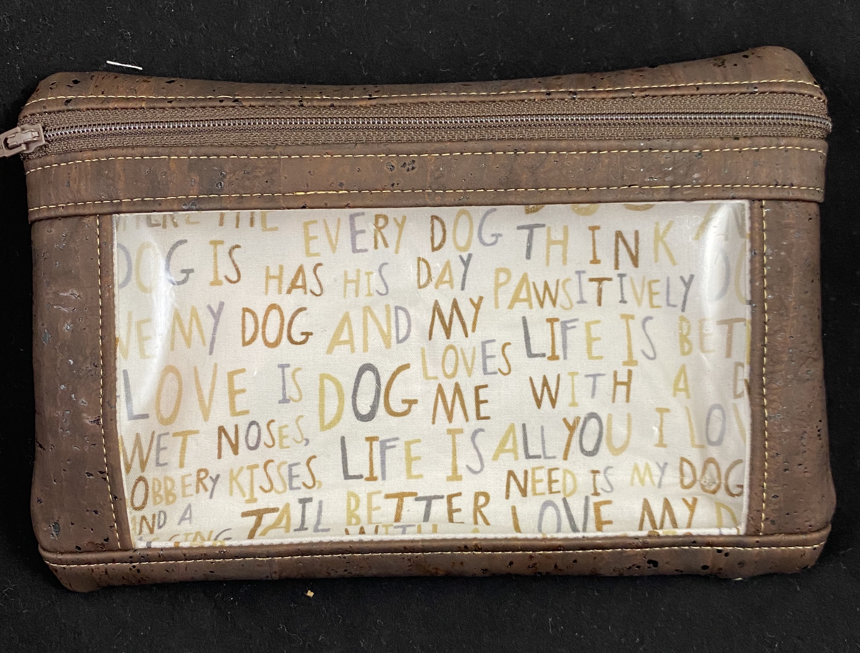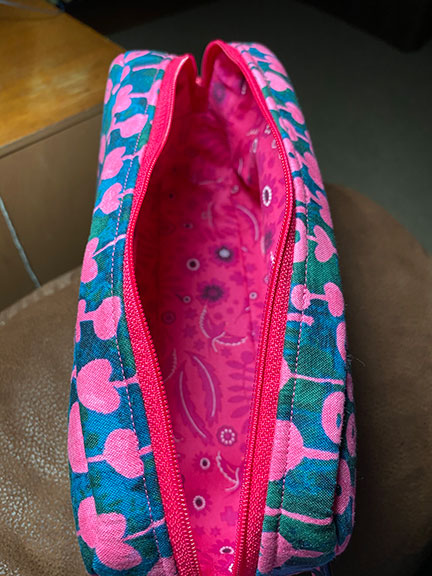I thought my granddaughter would like the I-Spy pouch to keep her school supplies together. The pouch has a vinyl insert on the front, allowing the use to see what’s inside. There was a problem in its construction that made me feel it wasn’t good enough to gift, so I kept it for myself. It sits by one of my sewing machines, holding large spools of thread. It’s made of a lovely cork fabric that Sara Lawson sells in her online shop. The lining is from Robert Kaufman’s Whiskers & Tails collection, “Dog Words” in Natural. Pouch finished on 9/7.