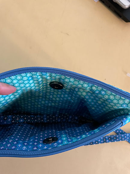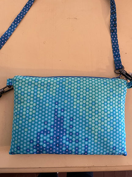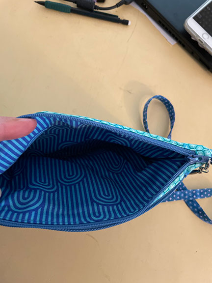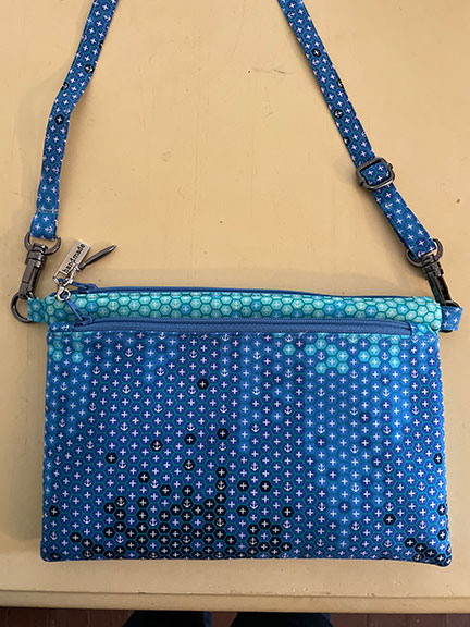 The Metro Double-Zip Pouch is one of my favorite patterns. I wish I knew how many of them I have made—I’m sure the number is at least 30. (Here’s the post from when I first started making them.) My daughter-in-law and her [10yo] baby girl, whom I refer to as “Miss C”, were in town for three weeks to help my son prepare to move to Amarillo to finally get to live with his wife. I was excited when Miss C asked for a sewing date with me to make a bag for herself. The day before our date, I had a Covid exposure scare, so cancelled the date, but set up a page where she could choose the fabric she wanted. She chose two fabrics the Tula Pink “Zuma” collection. The exterior fabric is “High Tide” in Aquamarine. The lining is “Tower 7″ in Aquamarine. I added ½” to the width of the pouch to make sure the main part of the bag would hold her phone with its chunky, blingy case. And she requested a crossbody strap. I made both the crossbody and the wristlet straps so she’ll have more flexibility when she uses the bag. I was in such a hurry to get the bag to them before they left to return home to Amarillo that I forgot to take photos. Thanks to Miss C’s mama for snapping the pics for me. Finished November 15.