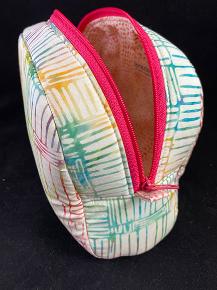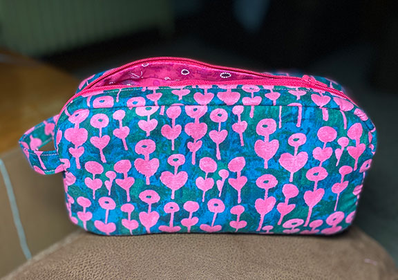 A Persimmon Dumpling Pouch in of a gorgeous melange of colors. I really am such a fabric freak. (There’s another term that’s used, but this is a family-friendly space.) I bought this Allison Glass fabric for a Rockstar Bag sewalong. Don’t look for the blog post about it; I haven’t finished it yet! The exterior fabric is Lilliput and the color is Sunset. The lining fabric is Starfish and the color is Ocean. Finished November 4.