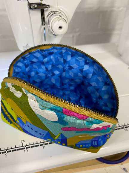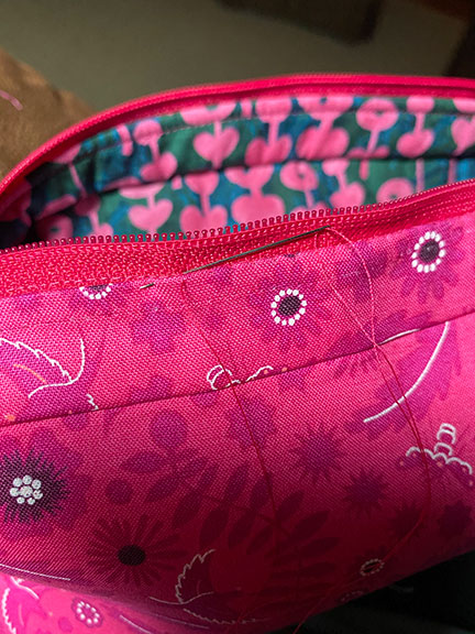 Another pattern I hadn’t made before—the Moto pouch—is like a half a Disco Double-Zip Pouch. Since I had just finished the Disco, this was an easy make for me. Pouch started on 10/3; realized I didn’t have enough of the lining fabric. Ordered on 10/3. I had bought the lining fabric at Interquilten, a LQS that used to be located in Interlochen, Michigan, about two miles from Interlochen Center for the Arts, my happy place. A couple of years ago they moved into Traverse City, across Airport Road from the mall. I’m sure they get much more traffic there than they did so far from the city. But I bought it back in around 2014, so it was no longer in stores. But that’s the beauty of Etsy fabric vendors. They buy their stock when it first comes out, and you’re frequently able to find new old fabric when you run out of something you love. Mine came, I finished the pouch, and the date was October 14.